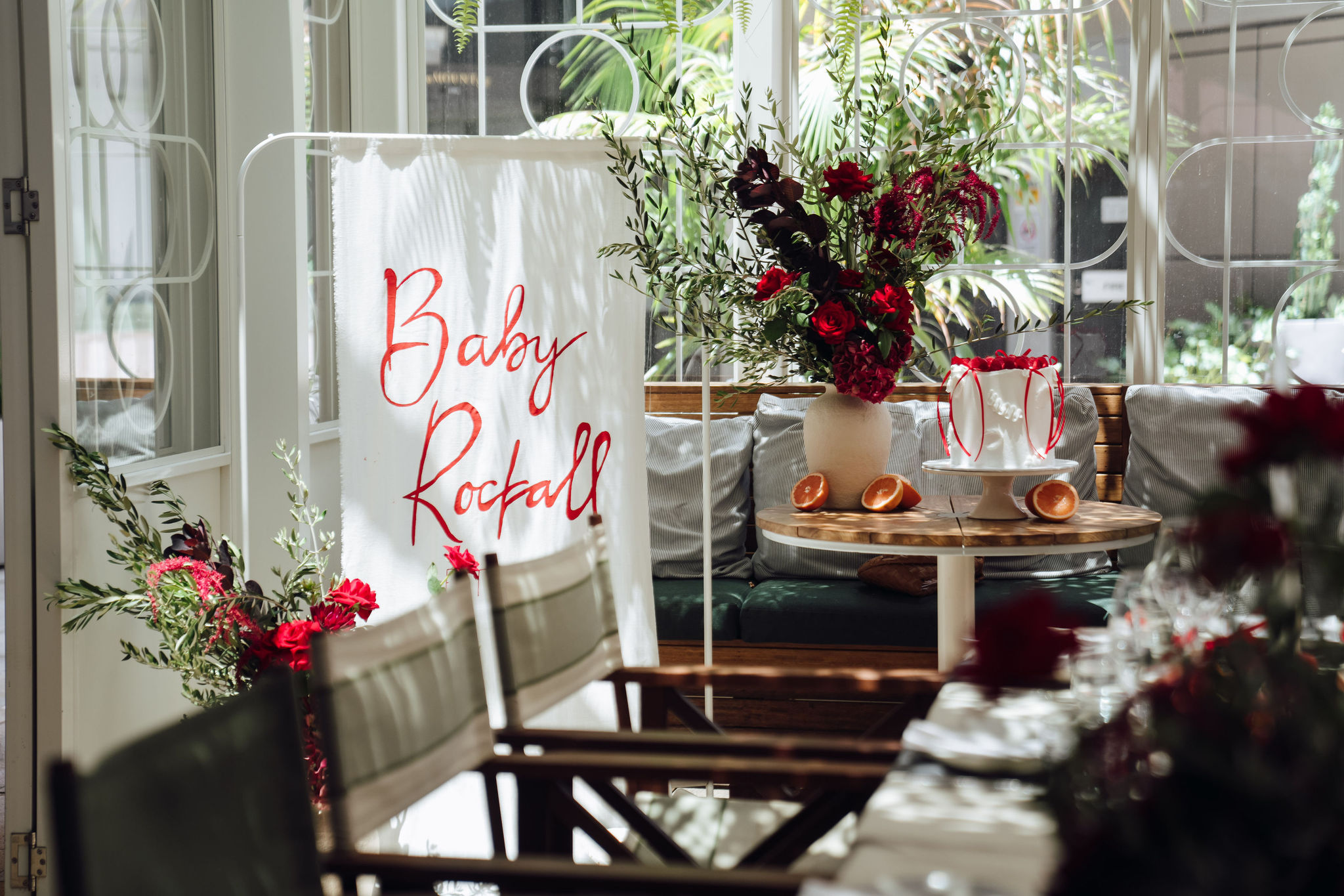 Stepping away from conventional baby shower décor, Jess envisioned a celebration inspired by the couple’s love for Italy and Campari Spritz, discovered during a recent trip, thus coming up with the name ‘Baby Spritz’. The neutral backdrop provided the perfect canvas, enhanced by pops of red through flowers, fruits and ribbons. With the afternoon sunshine providing the perfect dappled lighting, the Arbour encapsulated Jess’s vision for a lingering luncheon perfectly.